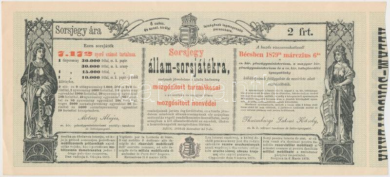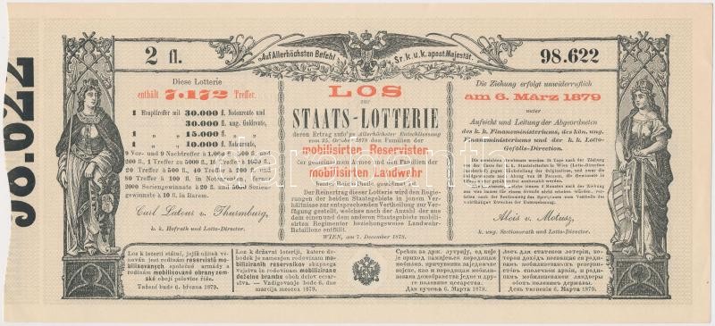 Ausztria / Bécs 1879. "Sorsjegy állam-sorsjátékra a közös hadsereg mozgósított tartalékosai s az osztrák és magyar állam mozgósított honvédei családjai javára" T:I- Austria / Vienna 1879. "State Lottery Ticket for the Reservist of the Joint Army and the Families of the mobilized Honved's" C:AU