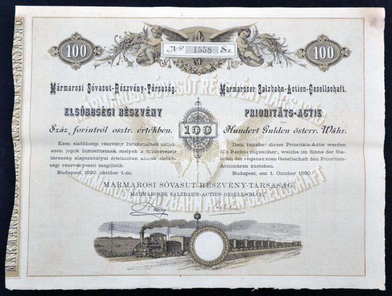 Leírás: Budapest 1890. "Máramarosi Sóvasut-Részvény-Társaság" elsőbbségi részvénye 100Ft-ról szárazpecséttel, szelvényekkel T:II-