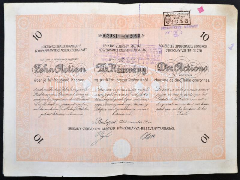 Leírás: Budapest 1923. "Urikány-Zsilvölgyi Magyar Kőszénbánya-Részvénytársaság" 10 részvénye egyenként 5000K-ról szelvényekkel, bélyegzésekkel T:III