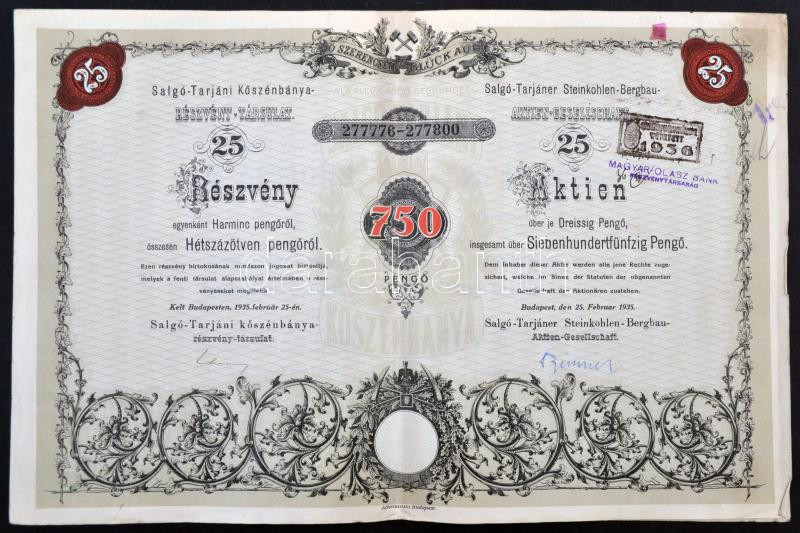 Leírás: Budapest 1935. "Salgó-Tarjáni Kőszénbánya Részvény-Társulat" 25 részvénye összesen 750P-ről bélyegzésekkel és szárazpecséttel T:III