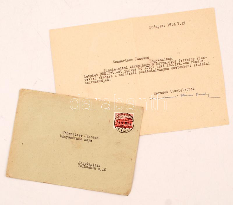 Leírás: Komáromi Kacz Endre festőművész saját kézzel aláírt levele melyben festményéért fizetendő vételár részletet kér.