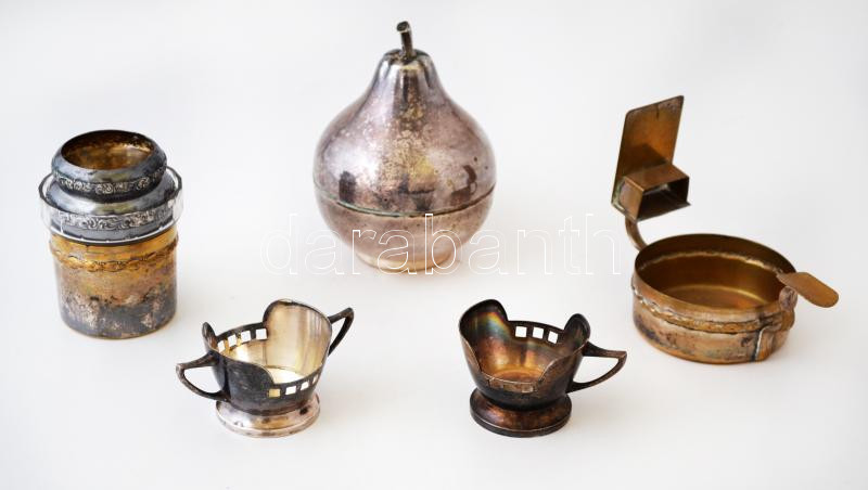 Leírás: 7 db különféle fémtárgy, hamutál, tartók, stb., köztük Argentor is, egy részük jelzett, különböző méretben
