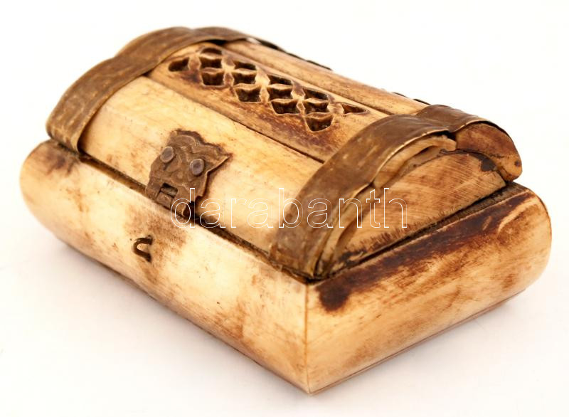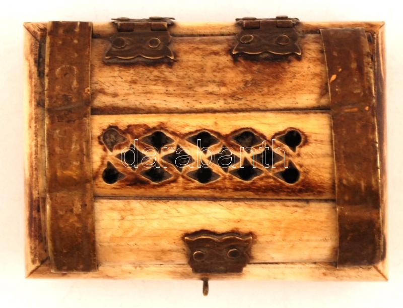 Leírás: Díszesen faragott, réz rátétes csont dobozka, bársony béléssel, 9×6,5×4 cm