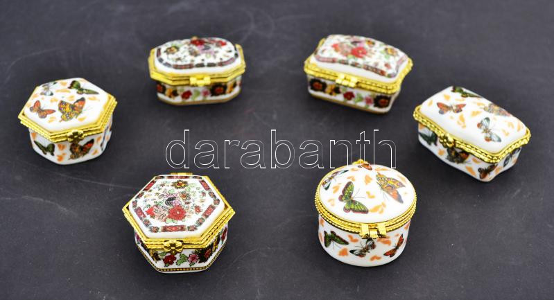 Leírás: Ékszertartó virág- és pillangómintás porcelán dobozkák, matricásak, hibátlanok, 6 db, 5x3 cm