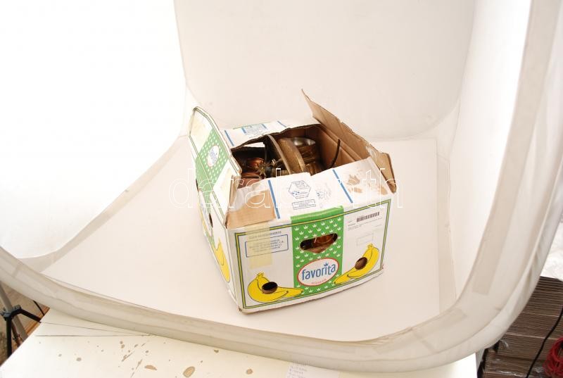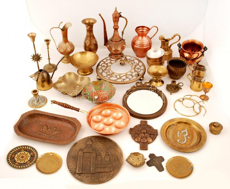 Leírás: Nagy doboznyi vegyes réztétel: gyertyatartó, díszes kancsók, tálkák, stb.