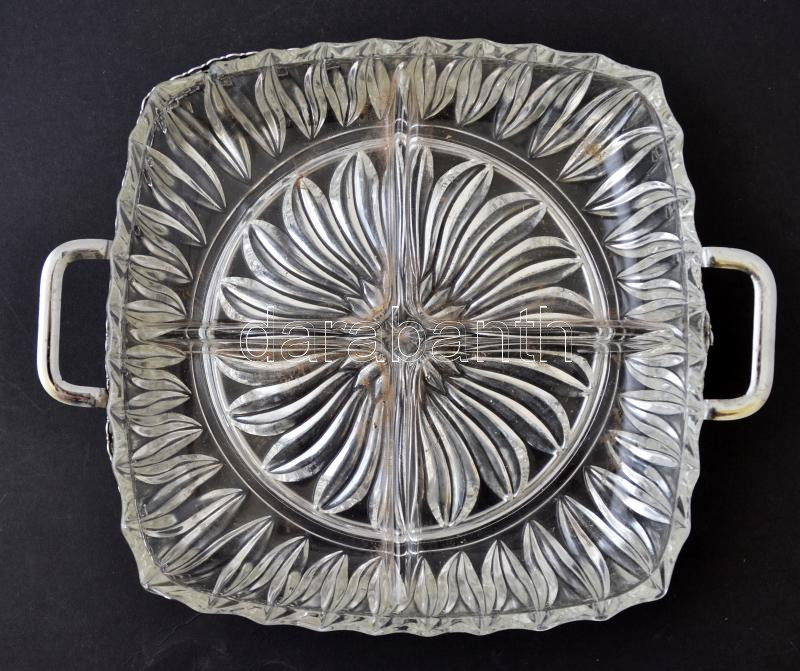 Leírás: Nagyméretű, négyrekeszes üveg kínálótál, kis lepattanással, fém talapzattal. 22x22x4 cm.