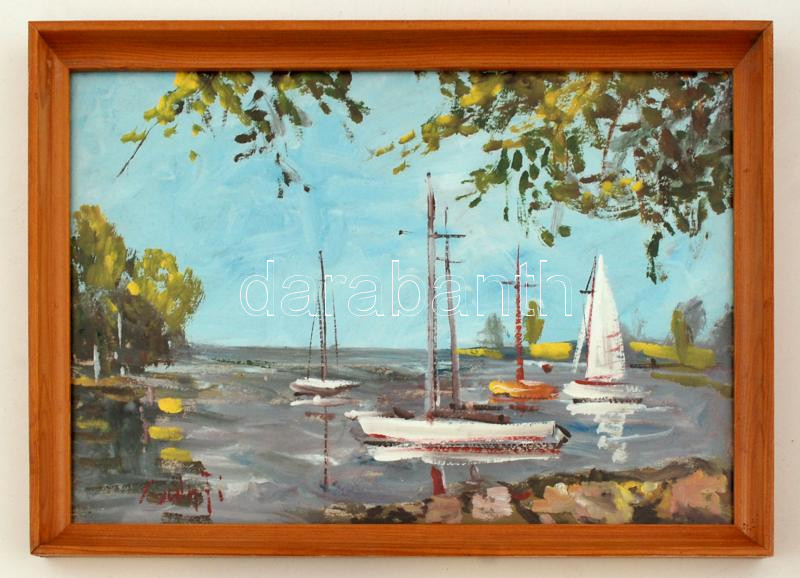 Leírás: Bánfi jelzéssel: Vitorlások a Mólónál. Olaj, karton, üvegezett keretben, 23×32 cm