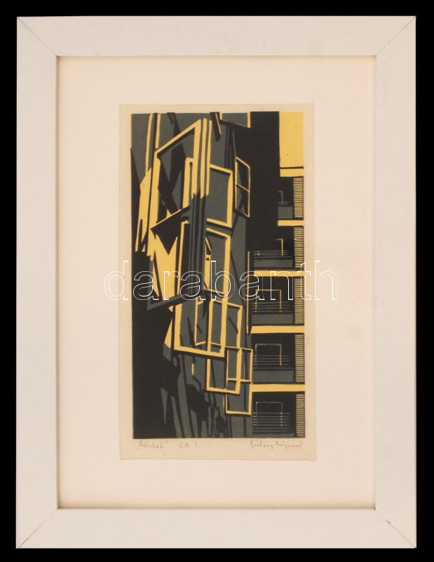 Leírás: Sárkány Zsigmond (?-): Ablakok. Linómetszet, papír, jelzett, üvegezett keretben, 28×20 cm