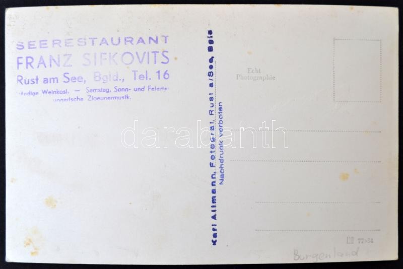 Leírás: "Horváth Jancsi cigányzenekara" Rust-i étteremben, Burgerland, Franz Sifkovits pecséttel, fotólap, 9x13cm