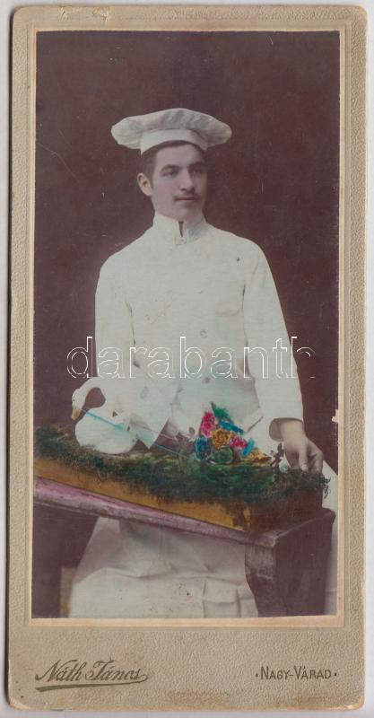 Leírás: cca 1910 Suhajda József(1886-1948) cukrász, csokoládégyáros a győztes süteménnyel, színezett keményhátú fotó, 16x8 cm