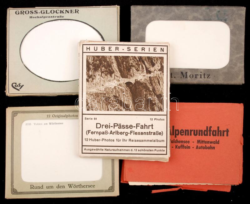 Leírás: cca 1930 Gross-Glockner, Dei-Passw Fahrt, Grosse Alpenrundfahrt (szakadt), Rund um den Wörthersee, St. Moritz, kb 50 kisméretű fotó (7×9 cm)