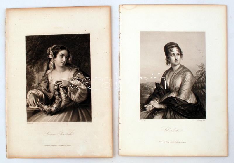 Két acélmetszet a "Goethe-Galerie. Charaktere aus Goethe's Werken" (Goethe Galéria: Szereplők Goethe műveiben.) Egyiken Charlotte, a Vonzások és választások szereplője, másikon Leonora Sanvitale, a Tarquato Tasso c. műből. Papír, jelzett, 16,5 x 12 cm.