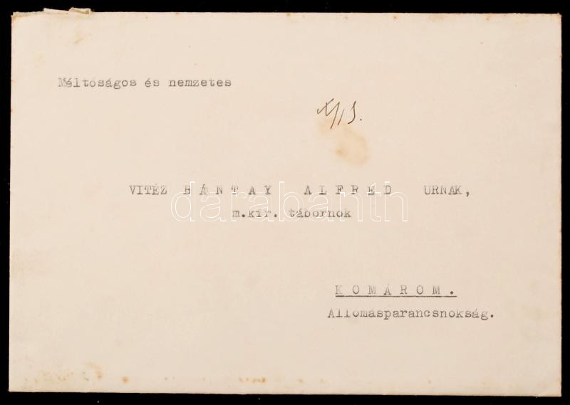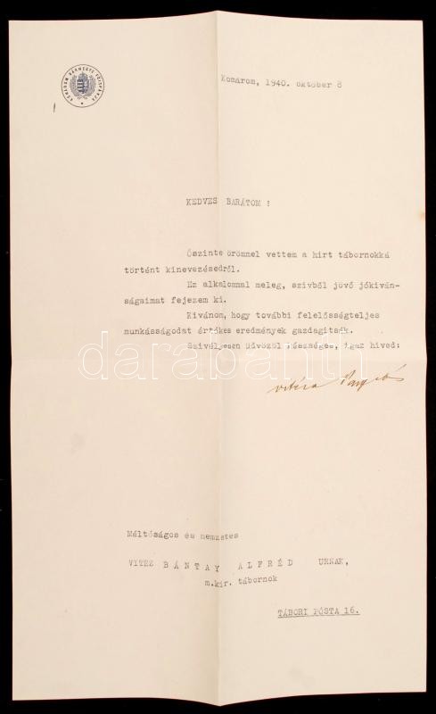 1940 Komárom, Komárom vármegye főispánjának aláírt elve Bántay Alfréd ... https://www.darabanth.com/hu/265-Gyorsarveres/265.0/Festmeny-mutargy-papirregiseg-egyeb/Militaria~25/1940-Komarom-Komarom-varmegye-foispanjanak-alairt-elve-Bantay-Alfred-tabornoknak~II1311785