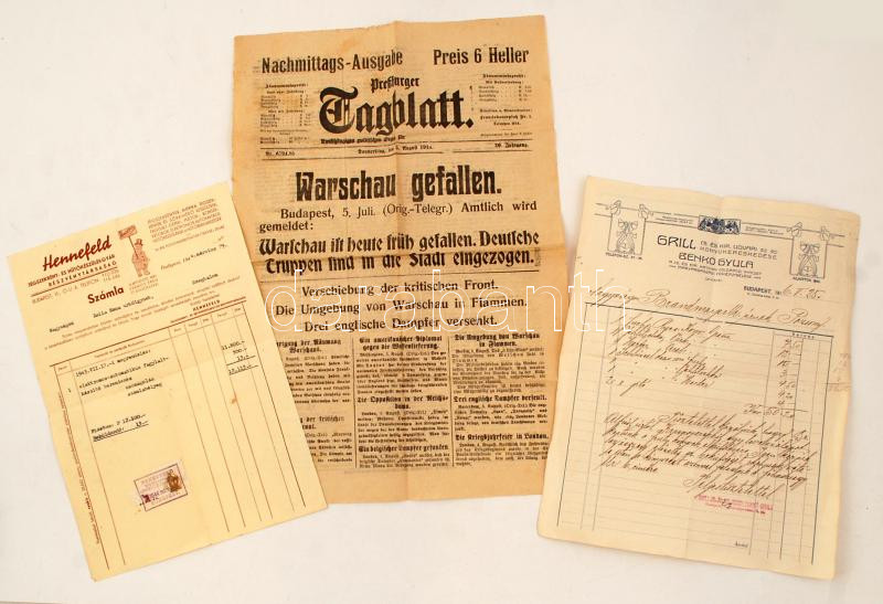 Leírás: 1915-1930 Vegyes nyomtatványok: jégszekrénygyári számla, könyves számla, I. világháborús újság