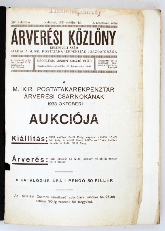 1933 az Árverési Közlöny 14. évf. 3. rendkívüli száma (tiszteletpéldánya) benne az aukció részletei, árak, ceruzás jegyzetekben leütési ár. Kissé viseltes papírkötésben. pp.:136, 23x15cm