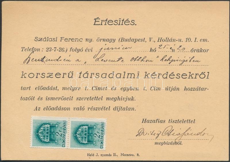 Leírás: cca 1935 Meghívó Szálasi Ferenc Szentendrén tartott előadására