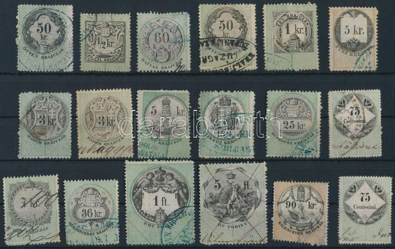 Leírás: 18 db okmánybélyeg közte ívvízjel, sok Ladurner, elfogazás stb 1 osztrák + 2 Lombard Velence