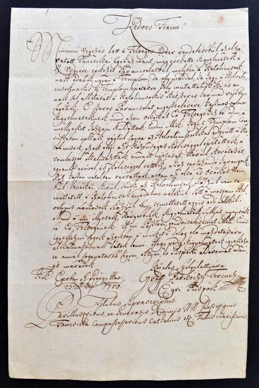 1756 Eger, Barkóczy Ferenc (1710-1765) egri püspök magyar nyelvű levele a fancsikai templom visszaadásáról a katolikusoknak és új református templom építéséről, az érsek aláírásával