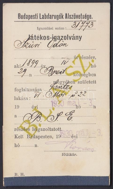 1930 a Budapesti Labdarúgók Alszövetsége fényképes játékosigazolványa ... https://www.darabanth.com/hu/265-Gyorsarveres/265.0/Festmeny-mutargy-papirregiseg-egyeb/Okmanyok~16/1930-a-Budapesti-Labdarugok-Alszovetsege-fenykepes-jatekosigazolvanya-labdarugo-reszere~II1324793