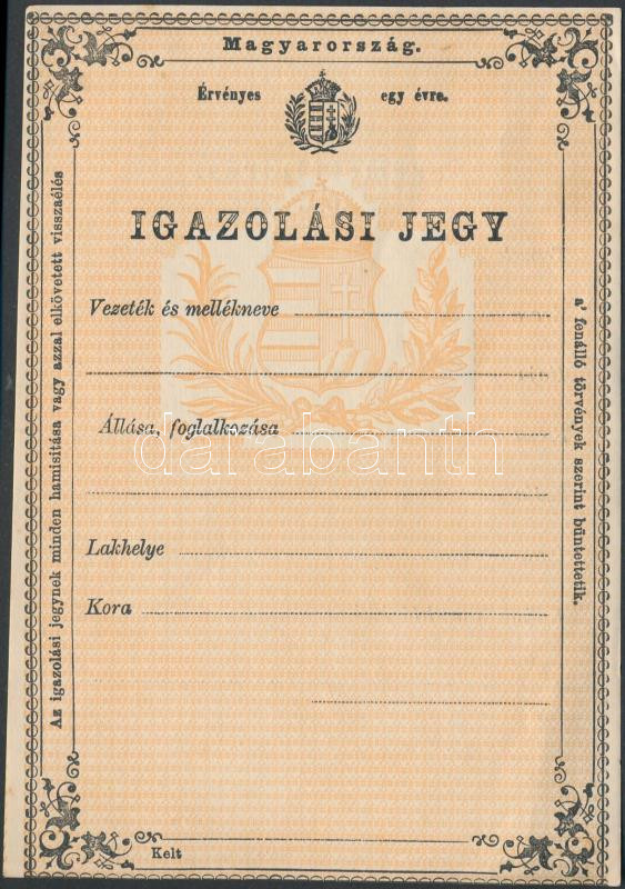 Leírás: cca 1890 Kitöltetlen igazolási jegy