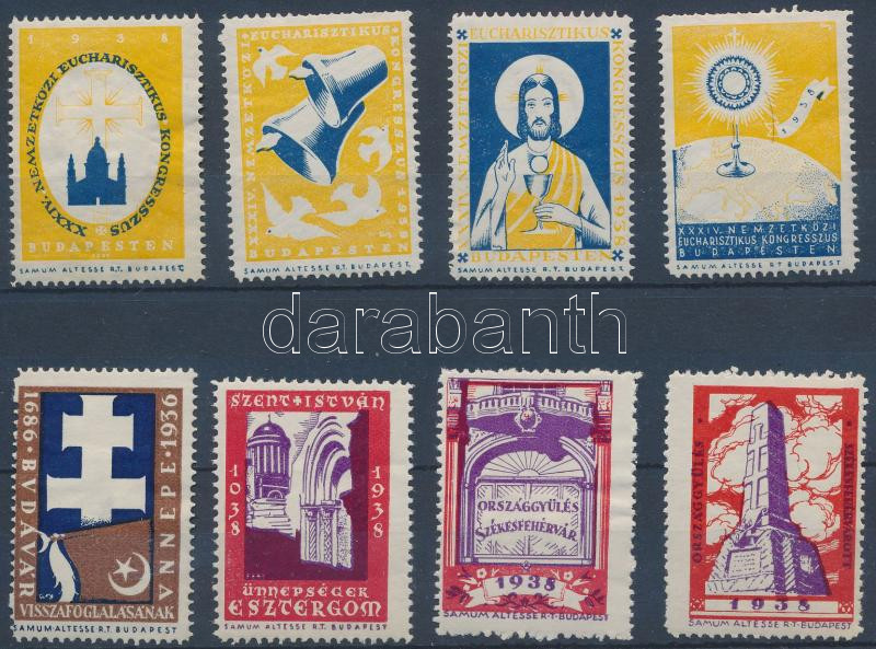 Leírás: 1938 Nemzetközi Eucharisztikus kongresszus 4 db levélzáró és Budavár, Esztergom, Székesfehérvári Országgyűlés 4 klf segélybélyeg