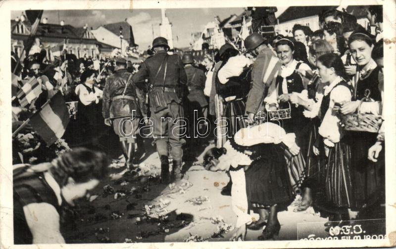 Leírás: 1940 Kolozsvár, Cluj; bevonulás, katonák, ünneplők népviseletben / entry of the Hungarian troops, soldiers, celebrating woman in traditional dress, 'Kolozsvár visszatért' So. Stpl. (EB)