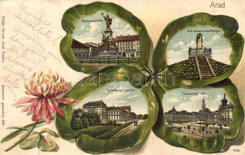 Leírás: Arad, Vértanú szobor, a 13 aradi vértanú vesztőhelye, Igazságügyi palota, Városház tér; kiadja Kerpel Izsó / statue, monument, palace of justice, town hall square, clover, floral, Emb. litho (fa)