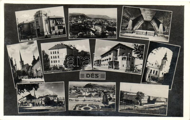 Dés, Dej; Nemzeti bank, sóbánya, Református templom, Állami főgimnázium, O.T.I. székház, Honvéd laktanya, Városi színház, Római Katolikus templom / bank, salt mine, church, grammar school, barracks, theater (EK)