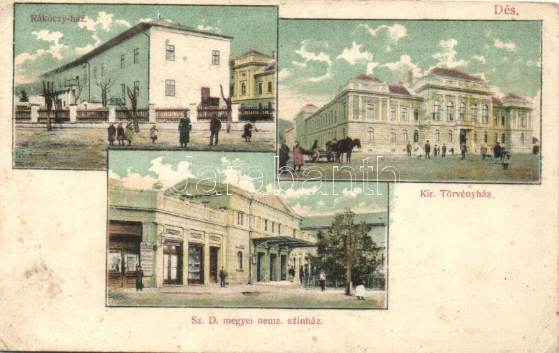 Leírás: Dés, Dej; Rákóczy-ház, Királyi Törvényház, Sz.D. megyei Nemzeti Színház, kiadja Gálócsi Samu könyvkereskedő / Rákóczi House, courthouse, theater (EB)
