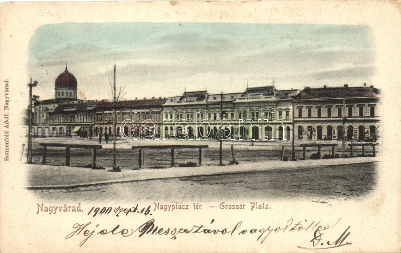 Leírás: Nagyvárad, Oradea; Nagypiac tér, zsinagóga. Kiadja Sonnenfeld Adolf / market place, synagogue (EB)