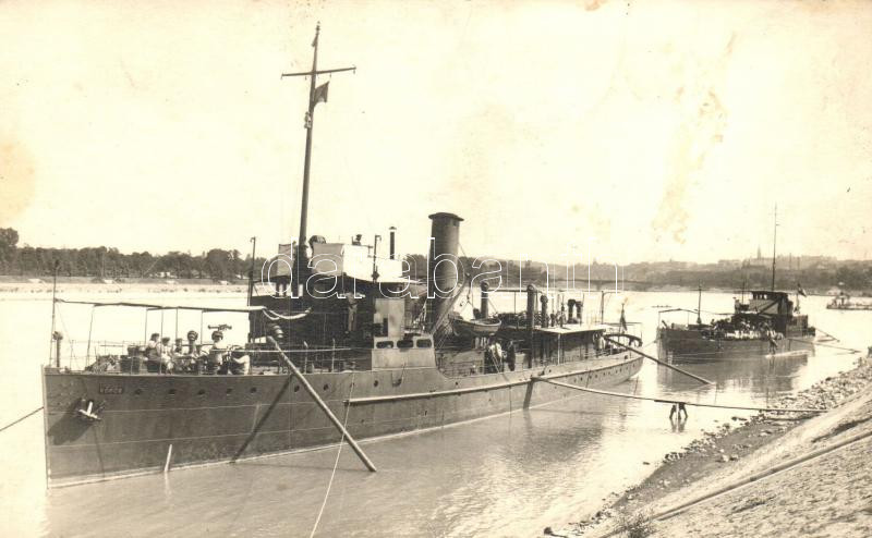 1929 A M. Kir. Folyamőrség KŐRÖS (iskolahajó) aknarakó hajója a Margit-sziget melletti budai ágban, haditengerészekkel a fedélzetén / Hungarian stream guard mine-layer ship with mariners on board, photo (fa)