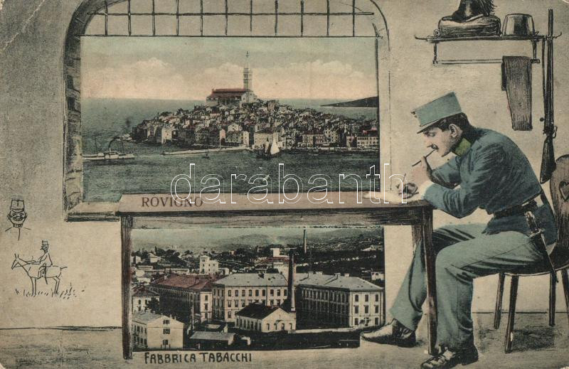Leírás: Rovinj, Rovigno; látkép, dohánygyár, katona / panorama, tobacco factory, soldier (Rb)