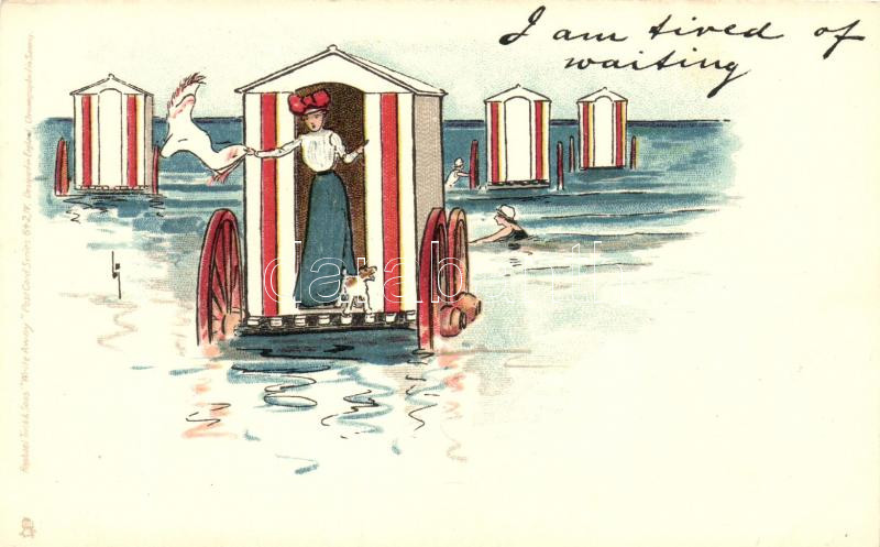 Leírás: 'I am tired of waiting' / Lady in bathing cabin, Raphael Tuck & Sons Write Away Series No. 642 IV., litho, s: L. Thackeray