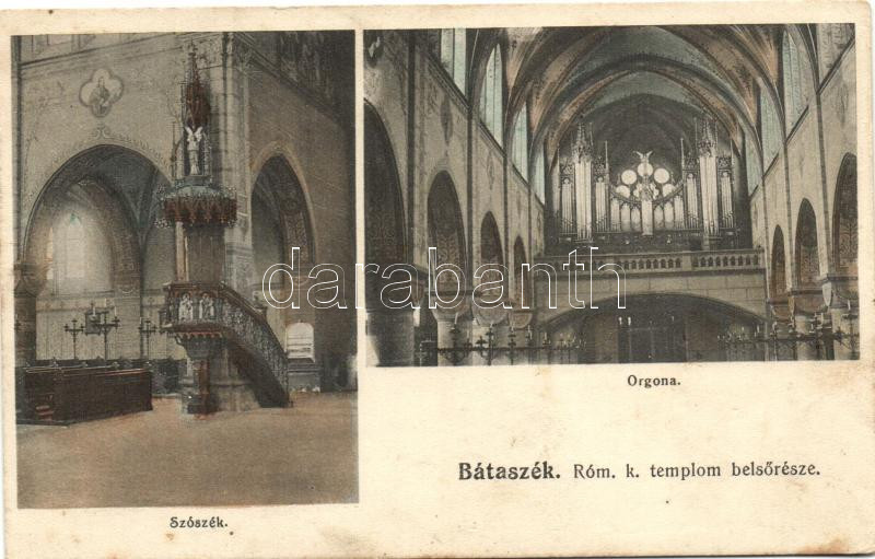 Leírás: Bátaszék, Római katolikus templom, belső, szószék, orgona, kiadja Thier Ferencz