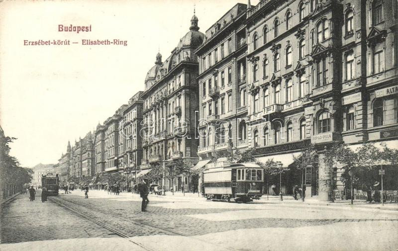 Leírás: Budapest VII. Erzsébet körút, Leszámítoló-Pénzváltó Bank, Leopold Gyula üzlete, villamos