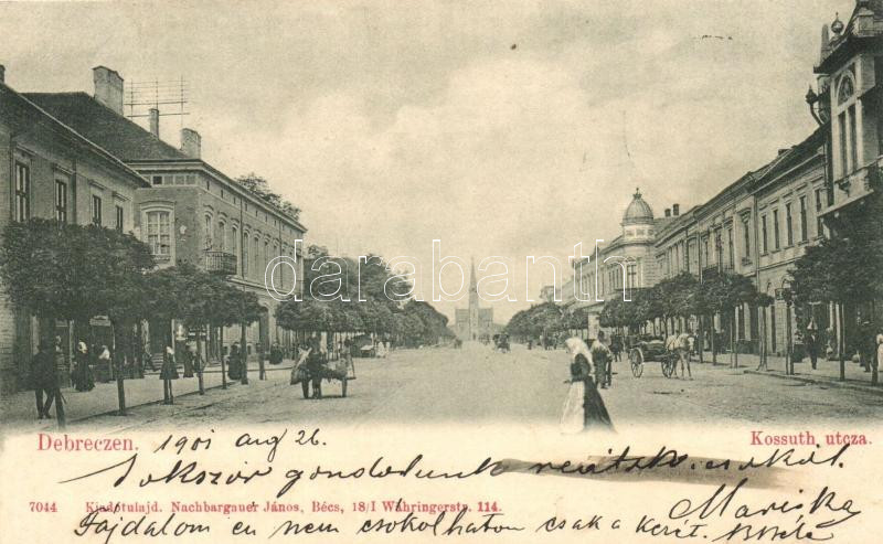 Debrecen, Kossuth utca, kiadja Nachbargauer János https://www.darabanth.com/hu/265-Gyorsarveres/265.0/Kepeslapok/Magyarorszag~300059/Debrecen-Kossuth-utca-kiadja-Nachbargauer-Janos~II1328482
