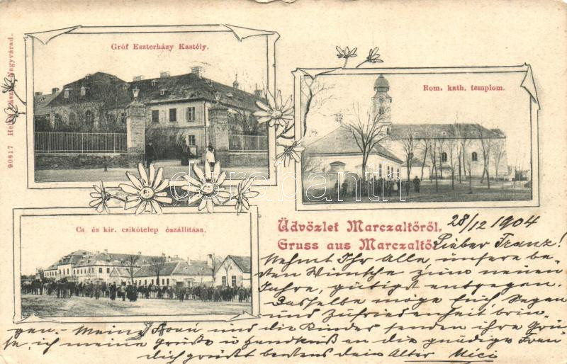 Leírás: Marcaltő, Gróf Eszterházy kastély, Római Katolikus templom, Cs. és kir. csikótelep, floral, kiadja Helyfi László (EM)