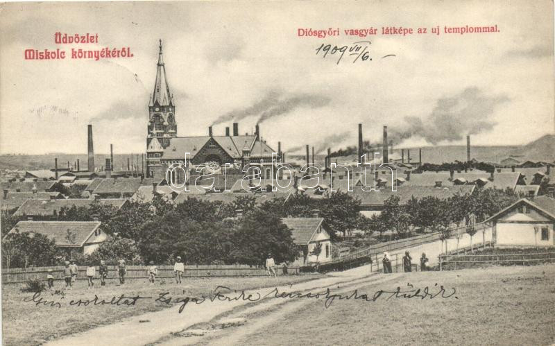 Leírás: Miskolc, Diósgyőri vasgyár látképe az új templommal, kiadja Grünwald Ignác (ferdén vágott / slant cut)