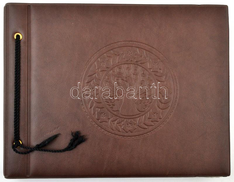 ~140 db MODERN, színes, motívum képeslap, barna színű albumba ragasztva, nagyrészt magyar folklór, néhány lap összeragadt / ~140 modern, color motive postcards glued in brown color postcard album, folklore motive, mainly Hungarian, some pages stuck together