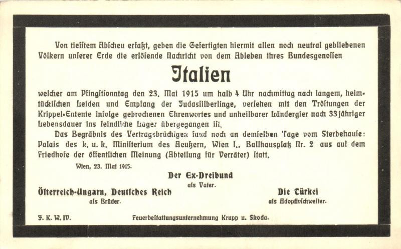 Italien, Todbericht / mock-obituary postard of Italy, Austrian WWI pro... https://www.darabanth.com/hu/265-Gyorsarveres/265.0/Kepeslapok/Propaganda-politika~300092/Italien-Todbericht-mock-obituary-postard-of-Italy-Austrian-WWI-propaganda~II1330202