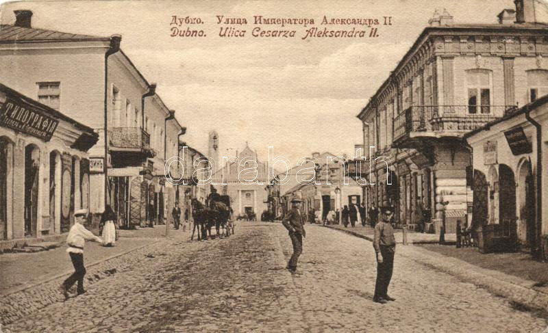 Dubno, Ulica Cesarza Aleksandra II / street, shops (EK) https://www.darabanth.com/hu/265-Gyorsarveres/265.0/Kepeslapok/Ukrajna~300084/Dubno-Ulica-Cesarza-Aleksandra-II-street-shops-EK~II1326760