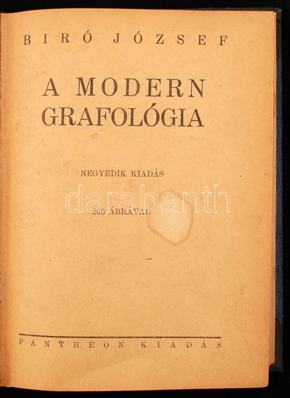 Biró József: A modern grafológia. 4. kiadás. Bp., 1943, Pantheon. 262 p. 266 szövegközti ábrával. A szövegben több helyen aláhúzásokkal. Korabeli félvászonkötésben.