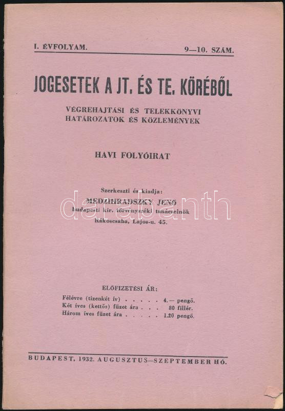 Leírás: Medzihradszky jenő: Jogesetek a JT., és TE. köréből. I. évfolyam 9-10. szám. 70p.