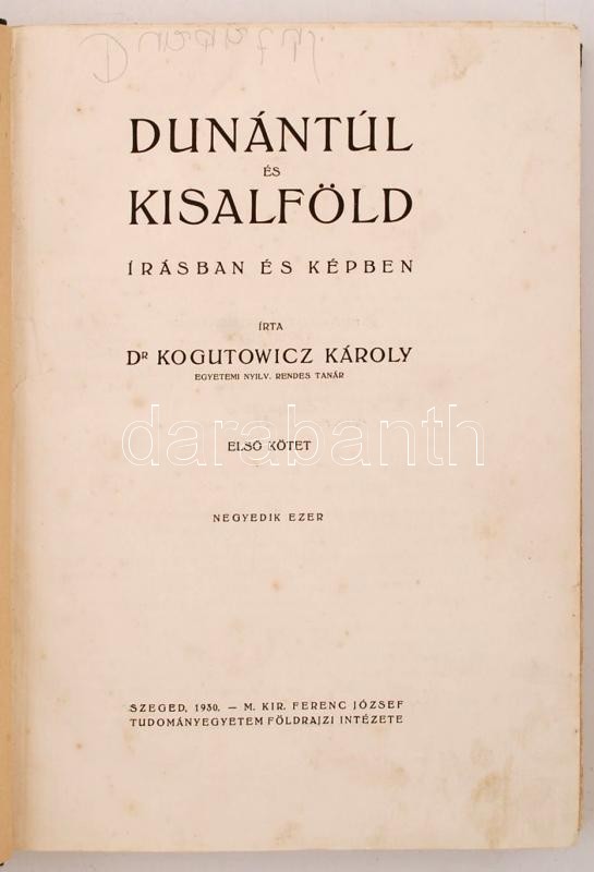 dr. Kogutowicz Károly: Dunántúl és Kisalföld írásban és képben. Első kötet. Szeged, 1930, M. Kir. Ferenc József Tudományegyetem Földrajzi Intézete. Számos szövegközti illusztrációval és térképpel. Az első térképmelléklet hiányzik. Kiadói kopott egészvászon-kötésben, néhány lap sérült. Dohos példány.