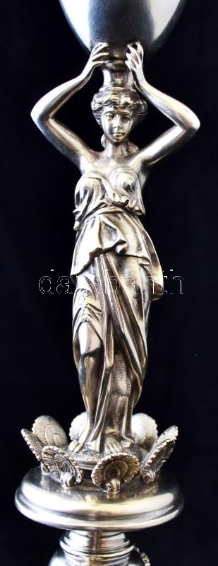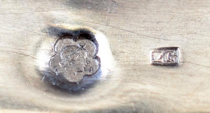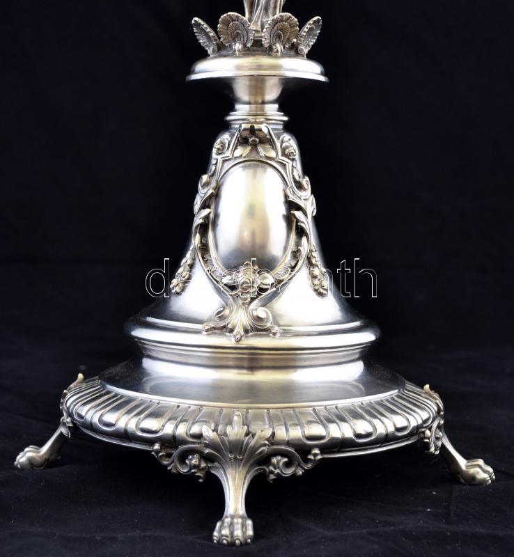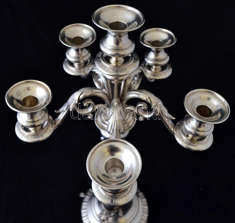 Ezüst (Ag.) neoklasszicista gyertyatartó, öt ágú hat láng hellyel, jelzett (Diana 1867-1937), mesterjeggyel (EG), vésett részeszekkel, felső rész kivehető, apró horpadással, m:52 cm, nettó:1900 g