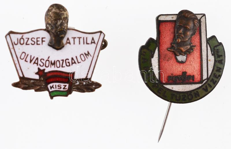 Leírás: 2db zománcozott jelvény: "A néppel tűzön vízen át - Petőfi" zománcozott fém jelvény (22x21mm) + "József Attila Olvasómozgalom - KISZ" zománcozott fém jelvény (22,5x21,5mm) T:2,2-