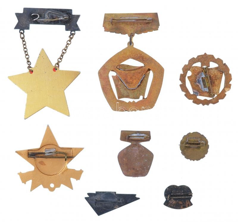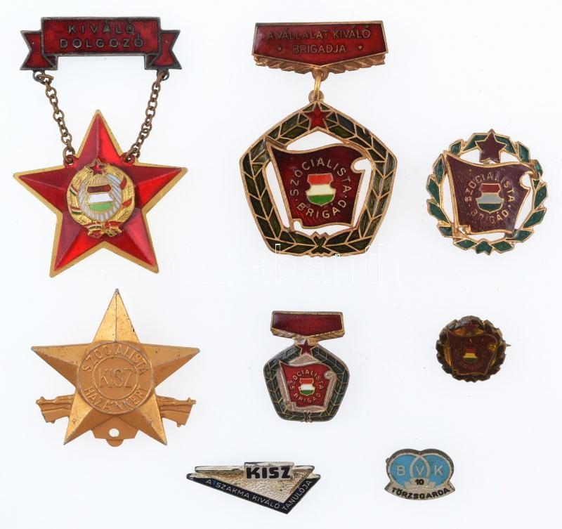 Leírás: 6db-os szocialista jelvény tétel: "Szocialista Brigád" (2xklf), "KISZ - Szocialista hazánkért", "KISZ - A szakma kiváló tanulója", "Kiváló Dolgozó", "BVK - Borsodi Vegyi Kombinát 10 éves törzsgárda" T:1-,2,2-