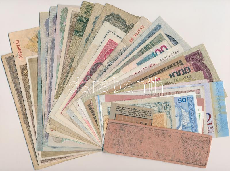 33db vegyes magyar és külföldi bankjegy, szükségpénz, közte Fülöp-szigetek, Sierra Leone, Venezuela pénzei és iraki hamisítvány is T:I-III