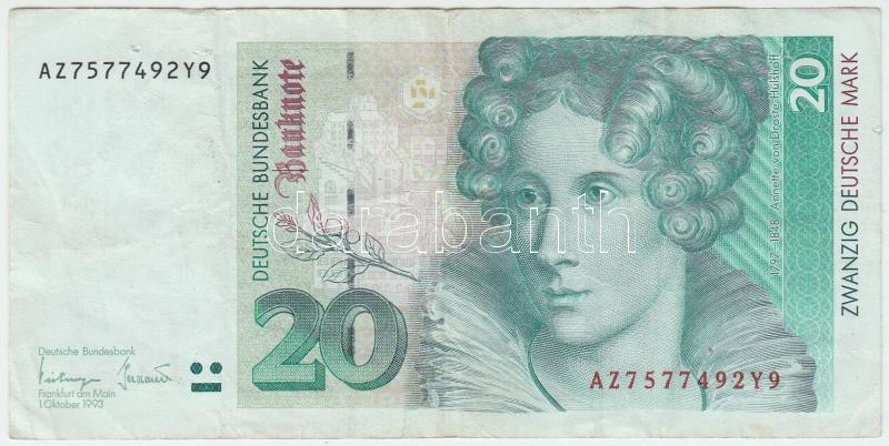 Germany 1993. 20 Mark C:F holes https://www.darabanth.com/hu/265-Gyorsarveres/265.0/Numizmatika/Kulfoldi-bankjegyek~400012/Nemetorszag-1993-20M-TIII-lyukak--Germany-1993-20-Mark-CF-holes~II1322612
