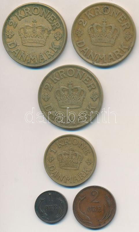 Denmark 1894. 1 Ore Br + 2 Ore Br + 1926. 2 Kroner Al-Br + 1930. 1 Krone Al-Br + 1936. 2 Kroner Al-Br + 1939. 2 Kroner Al-Br C:XF,VF